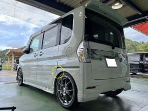 ダイハツ・タントカスタム、リアクォーター(リアフェンダー)の凹みをデントリペアで修理(岐阜) 今回はダイハツ・タントカスタムです。 ローダウンやアルミ等のカスタムが決まってますね(^^♪ リアクォーター(リアフェンダー)にできた凹み (黄〇) 工具がアクセスできませんので 表から引っ張りでリペアします! 凹みも目立たなくなり キレイにリペア完了です(^^♪ ありがとうございました!